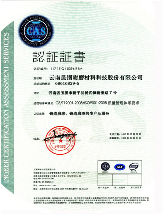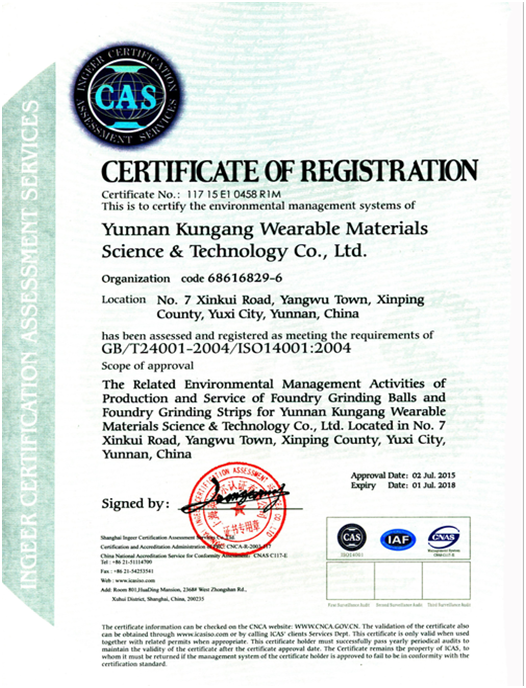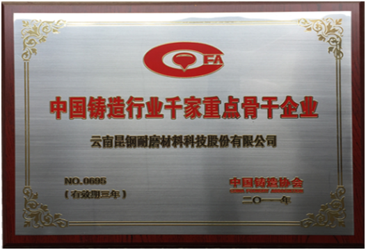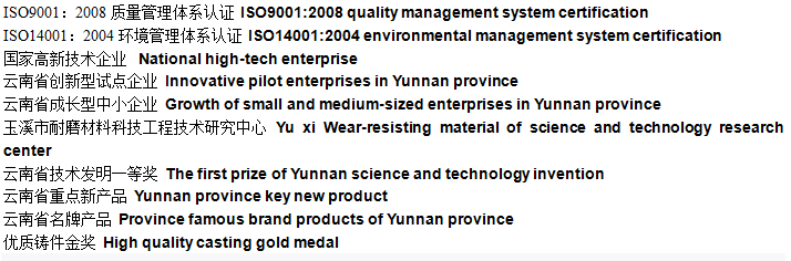 As the first wear resistant material producer listed on “new three board” in China, stock code 831212, Yunnan Kungang Wear Resistant Material Science Co.,Ltd. implements the market transaction. The company has obtained the ISO9001 quality system certificate, ISO14001 environmental management system certificate, national high-tech enterprise certificate, Yunnan high-tech enterprise certificate,Yunnan brand product certificate, China foundry association membership certificate. The company has found Yuxi Wear-resisting material of science and technology research center and won honners,such as the high quality casting gold medal the first prize of Yunnan science and technology invention and so on.